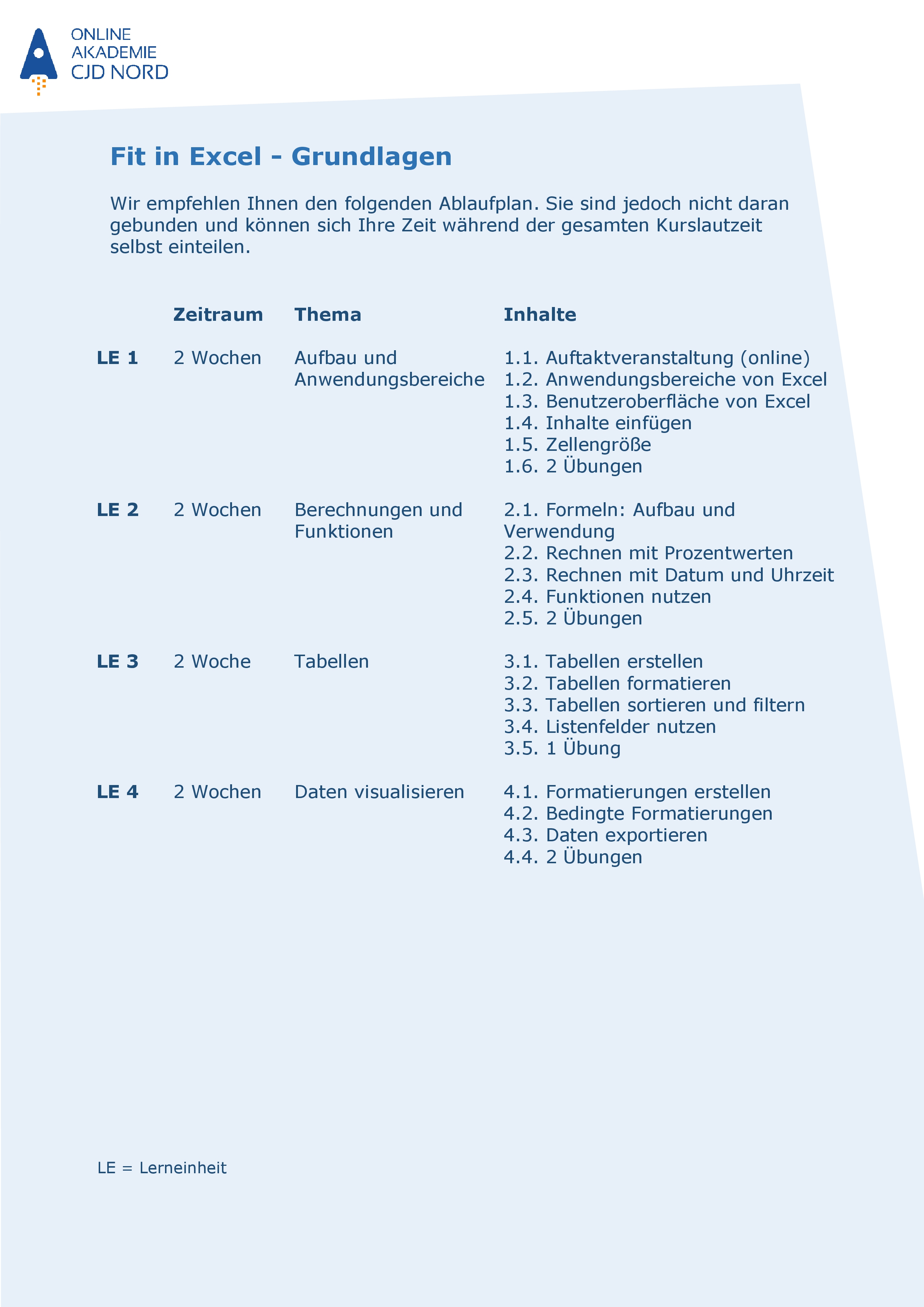 In zahlreichen Übungen arbeiten Sie sich gründlich in Excel ein und lernen die Arbeitsumgebung von Excel kennen. Weiter beschäftigen Sie sich mit grundlegenden Funktionen des Programms.